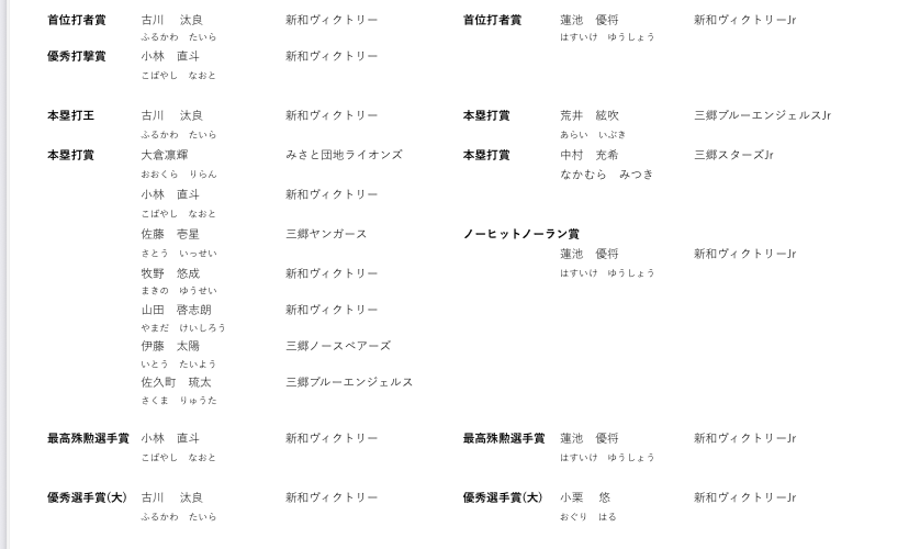 令和7年度三郷少年野球リーグ戦、全試合年間表彰